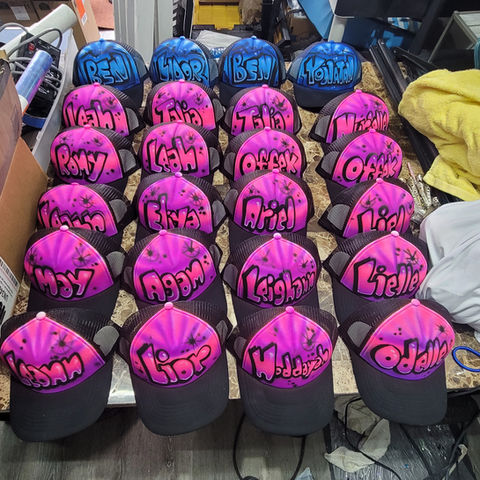 WHAT WE OFFER: Custom Airbrush Party Favors: • T-shirts • Caps & Hats • Hoodies • Sports Equipment • And More!